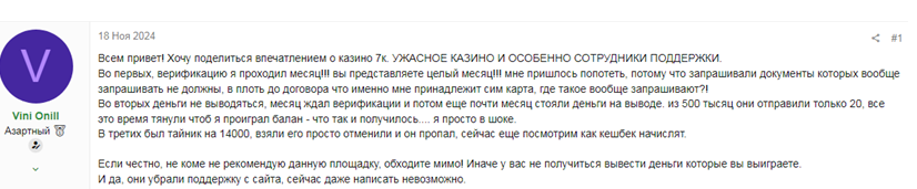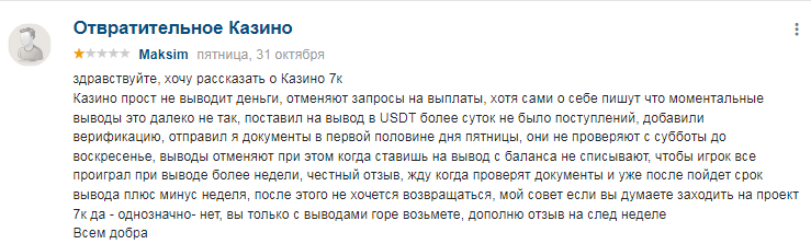 Отзывы клиентов помогают разобраться, что на самом деле представляет указанное азартное заведение. Горячие слова поддержки про 7К казино можно найти только в постах, которые явно подготовлены на заказ и больше напоминают рекламу. Честной обратной связи про рассматриваемого поставщика азартных услуг много как на форумах, так и у отдельных блогеров.