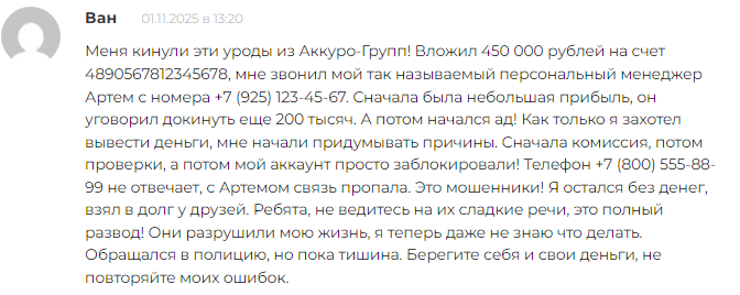 Площадка Accuro Group является опасным сетевым мошенником. Компания использует сведения реально существующего юридического лица и это затрудняет выявление скама. Все вложенные сюда трейдерами средства можно считать потерянными.