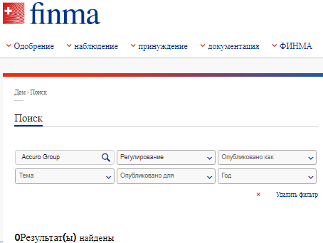 Согласно информации на сайте, зарегистрирована компания в Швейцарии. Это означает, что она должна иметь разрешительные документы от местного регулятора, но в реестрах Управления по надзору за финансовым рынком этой страны мы не нашли материалов о компании Accuro Group.