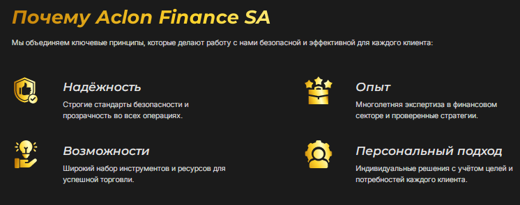 Брокерские компании уже не являются статичными участниками рынка. Сегодня их функции далеко выходят за рамки обычного предоставления посреднических услуг. Фирмы ведут исследовательскую деятельность и разрабатывают новые торговые инструменты. Площадка Aclon Finance обещает своим клиентом эксклюзивный уровень обслуживания и отличные условия сотрудничества. Что может на самом деле этот брокер — покажет небольшой аудит.
