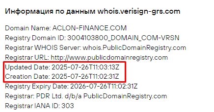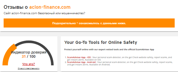 Синтетический анализатор мошенничества выдает страничке Aclon Finance только 31 балл. Такой низкий показатель не может быть у компании, которая относит себя к лидерам рынка. Мониторинговому боту не нравится, что фирма использовала регистратора, который часто обслуживает скамеров и спамеров.