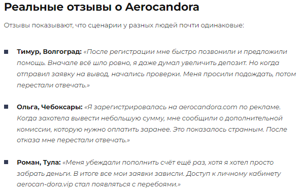 Любое сотрудничество с Aerocandora приведет к потере депозита. Фирма просто выдает себя за биржевого брокера, но реально является площадкой для кражи средств клиентов. Мошенники указали фальшивые контактные данные, поэтому найти их для восстановления справедливости будет сложно.