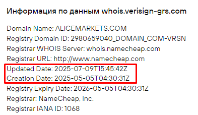 По данным интернет-реестра электронная страничка компании Alice Markets запущена в работу 5 мая 2025 года. Вот только в техническом описании самого сайт администрация указывает, что он действует с 2024. Такое разногласие в датах выглядит очень подозрительно. Похоже, брокер приписал себе несуществующий стаж коммерческой деятельности, чтобы выглядеть лучше, чем есть.