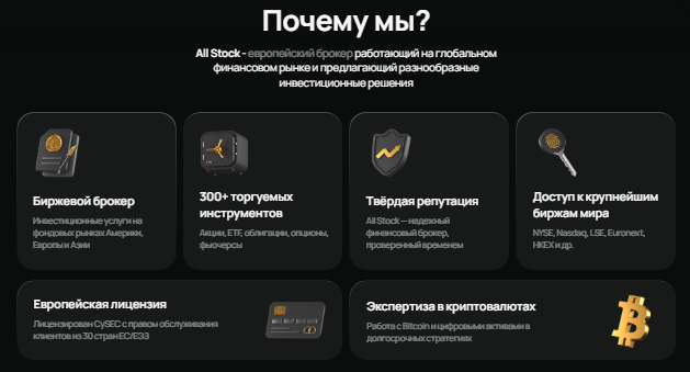 Тоже самое можно найти и у других фирм, поэтому чтобы выделиться перед конкурентами администрация All Stock заявляет о наличии у нее таких преимуществ: