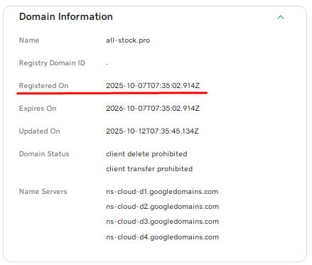 Запрос в интернет-реестр выдает данные, согласно которых сайт All Stock зарегистрирован только 7 октября 2025 года. Это значит то фирма очень молодая и точно не обладает достаточным опытом работы для обеспечения надежной деятельности брокеров.