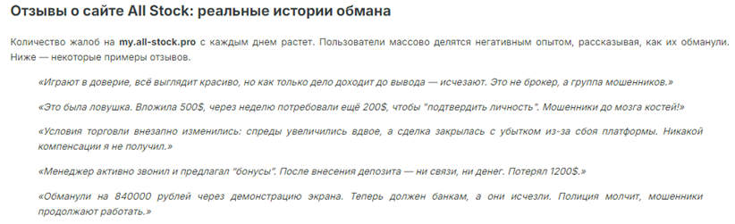 Сайт All Stock на самом деле относится к типовым скамерским инструментам. Эта фальшивая площадка пытается выглядеть как брокерская фирма, но в реальности действует под управлением аферистов и предназначена для похищения средств пользователей.