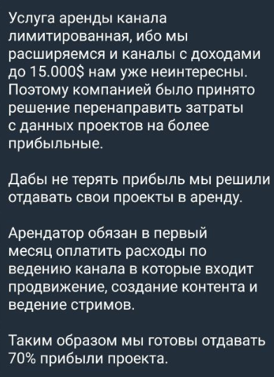 В выложенном ролике админ противоречит сам себе. Так, он утверждает, что партнерская компания предлагает взять в аренду каналы с монетизацией от 3 до 15 тысяч долларов только потому, что эти ресурсы неинтересны самой фирме в силу малозначительности. Почему-то площадка от них не отказывается и продолжает выделять сотрудников и ресурсы для их ведения.
