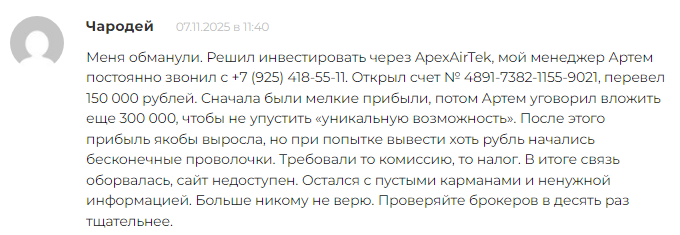 Отзывы подписчиков о Apexairtek не очень многочисленны, зато однозначно негативны. Клиенты указывают на полную невозможность ведения здесь прибыльных сделок. У кого-то даже получилось подключить торговый терминал, но заключенные там ордера только снижают депозит. Зато назначать здесь кэшаут полностью бесполезная затея, забрать отсюда свои деньги не вышло ни у кого.