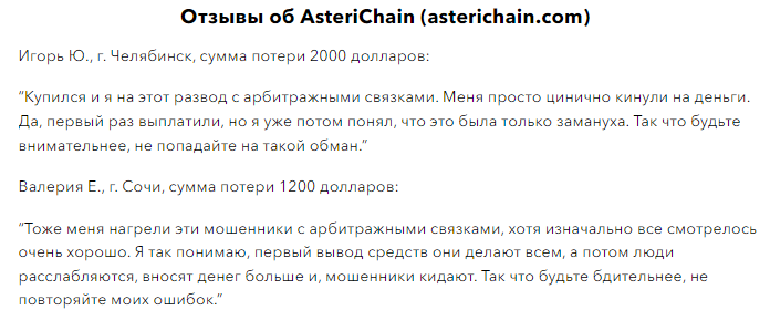 Нужна была площадка для проведения дублирующих сделок. Тарифы на сайте AsteriChain понравились, и я выбрал именно их. Сразу завел часть суммы и весь процесс заблокировался. Уже неделю переписываюсь с администрацией по поводу вывода моих денег, однако все бесполезно.