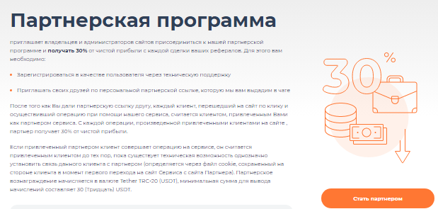 На сайте указывается, что среднее время проведения одной заявки составляет 7 минут. Это очень хороший показатель, который позволяет применять обменник AsteriChain даже для арбитражных связок. Также здесь действует партнерская программа, позволяющая иметь дополнительный доход. Трейдеры могут получать до 30% с части оборота приведенных ими сюда пользователей. Для того, чтобы вывести полученную указанным образом сумму ее размер должен быть не менее 30 USDT.
