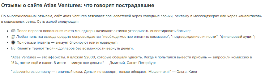 Сайт Atlas Ventures является поделкой биржевого брокера. Имитируя ответственного поставщика финансовых услуг, мошенники получают доверие подписчиков и выманивают инвестиции. Забрать потом отсюда свои средства почти невозможно.
