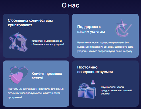 Сайт обменника ориентирован на профессиональных пользователей. Здесь нет излишеств, и ничего не отвлекает от проведения сделок. Прямо на головной страничке находится калькулятор, который позволяет рассчитывать и назначать операции. В списке доступных монет пока пребывает 25 наименований. Ассортимент явно уступает по своему объему предложений крупных бирж. Администрация убеждает подписчиков, что доступные токены покроют большую часть реальных запросов клиентов.