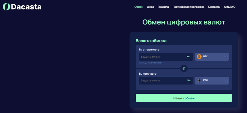 Спекуляции криптовалютами относятся к самым динамичным типам заработка на трейдинге. Высокая интенсивность ценообразования токенов всегда обеспечивает наличие монет, операции с которыми будут выгодными. Обменник Dacasta заявляет, что благодаря низким тарифам и объективному формированию стоимости ресурсов сотрудничать с ним очень выгодно. Является ли партнерство с ним верным шагом, покажет небольшой обзор.