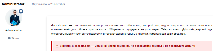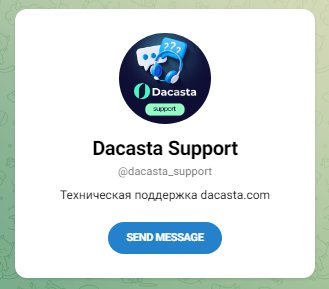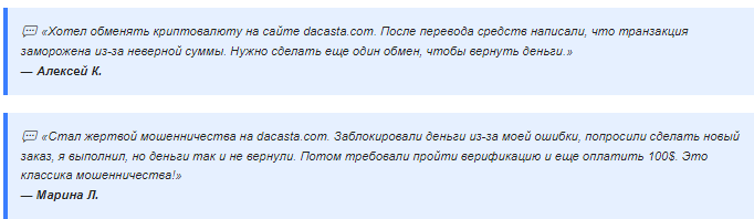 Любое применение конвертационного сервиса Dacasta запрещено. Это мошенническая платформа, которая занимается только воровством средств клиентов. Все поступившие им на криптокошелек монеты можно считать потерянными. Рекомендовать к сотрудничеству обменник Dacasta мы не можем.