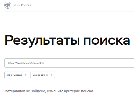 Фирма вообще не раскрывает свои юридические данные. Место регистрации конвертационного центра неизвестно. Сведения о наличии лицензии тоже остаются загадкой. На сайте указано, что компания действует согласно законодательства РФ. Это значит, что данные о ней должны быть в реестре Центробанка. Но запрос к главному финансовому регулятору страны выдает негативный результат. Dacasta действует нелегально, а значит может быть закрыт в любой момент.