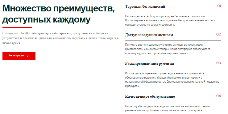 Работа брокерской компании обеспечивает трейдеров возможностью проводить биржевую торговлю. Однако одного этого условия мало, чтобы такая фирма могла рассчитывать на постоянный приток клиентов. Спекулянтов сегодня интересует всесторонняя поддержка и помощь при ведении операций. Фирма Ellis AG обещает кроме этого, еще целый ряд преимуществ. Что стоит на самом деле за подобной активностью, покажет проверка.