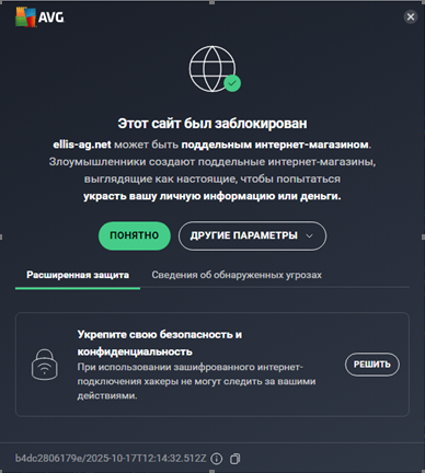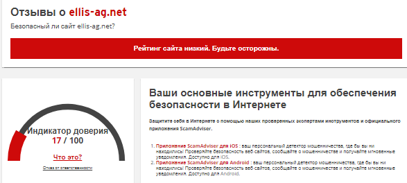 Синтетический анализатор мошенничества выдает компании Ellis AG всего 17 баллов из 100. Это значит, что в работе фирмы выявлены серьезные нарушения актуальных протоколов интернет-безопасности.