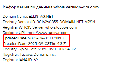 Сайт еще совсем молодой. При этом брокер утверждает, что работает с 2017 года. Но проверка регистрации домена ellis-ag.net/ опровергает данное заявление. Как видим запустили его только в конце сентября 2025 года.