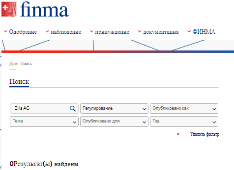 Так как брокер заявляет, что компания была зарегистрирована в Швейцарии, у нее должны быть документы, разрешающие вести ей финансовую деятельность. В реестре Управления по надзору за финансовым рынком этой страны нет данных о брокере Ellis AG.