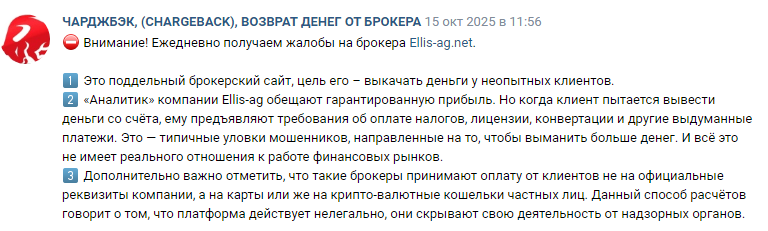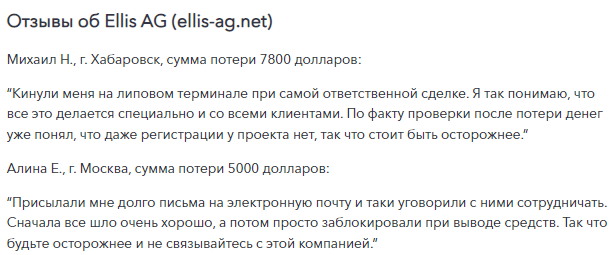 Изучение площадки Ellis AG показывает, что этот сайт на самом деле является скамерским инструментом. Вместо предоставления брокерских услуг происходит выманивание и хищение средств. Аферисты тщательно поддерживают личную анонимность и используют защищенные способы ведения транзакций, так что шансов на возврат вложенных сюда денег очень мало. Сотрудничать с компанией Ellis AG мы не рекомендуем.