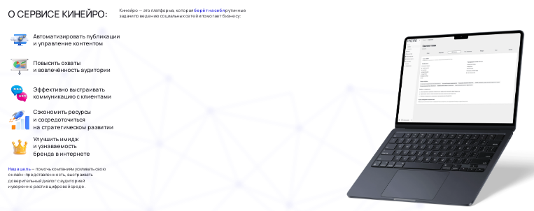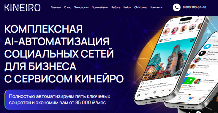 Сайт https://kineiro.ru/подготовлен профессионально и грамотно. Веб-дизайнеры последовательно и логично предоставляют здесь данные, поэтому понять, чем именно занимается фирма можно и без дополнительных вопросов. Как указывалось выше, компания сосредоточена на поддержке развития бизнеса клиентов в социальных сетях путем внедрения возможностей ИИ. Система позволяет организовать полностью самостоятельную работу в пяти социальных сетях без постоянного участия человека — это солидная экономия средств и времени. ИИ заменяет маркетолога, копирайтера и исследователя.