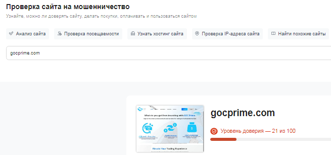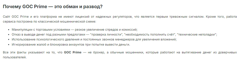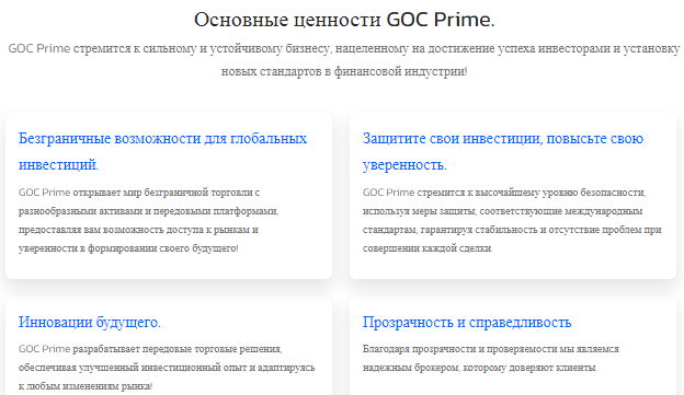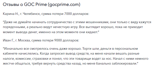 Очень часто в поисках дохода пользователи Интернета ведутся на рекламу онлайн-брокеров и попадают в руки настоящих мошенников. Все они работают по стандартной и предельно банальной схеме — привлекают клиентов красивой картинкой со статистикой и обещаниями, а потом просто нагло выманивают деньги, обещая нереальную прибыль. Именно таким брокером оказался проект GOC Prime, который зарекомендовал себя как ненадежный и мошеннический проект.