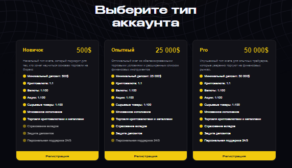 Для клиентов подготовлено 3 тарифных плана. Минимальный депозит составляет всего 500 долларов США. Моментальное выполнение сделок обещается вне зависимости от размера счета трейдера.