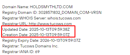 Компания заявляет, что достигла значительных показателей в работе и ее услугами воспользовались большее 10 миллионов человек. Вот только согласно сведений из интернет- реестра стало известно, что сайт Holdsmyth Ltd зарегистрирован лишь 13 октября 2025 года.