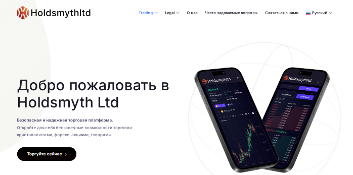 Сайт Holdsmyth Ltd создан и находится под контролем серийных мошенников. Эти скамеры ориентируются на трейдеров, которые еще не обладают достаточным опытом и готовы поверить красивым обещанием о выгодных условиях торговли. Любое применение данного брокера запрещено и повлечет потерю депозита.