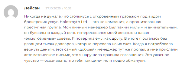 Сначала мне показалось, что Holdsmyth Ltd — это порядочная площадка. Зарегистрировался быстро, и с заведением на счет денег проблем тоже не было. А вот потом начался кошмар. Все сделки заканчивались убытками. Когда запросил кэшаут, то меня заблокировали. Администрация не отвечает.