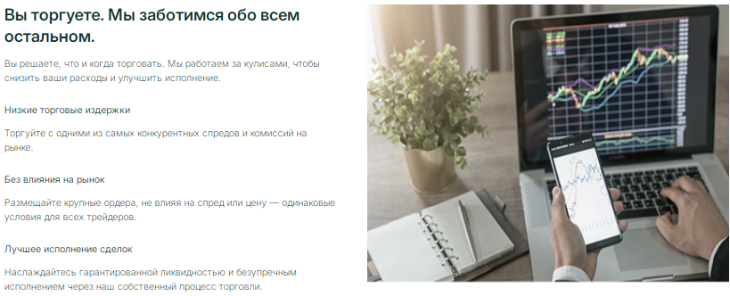 Страничка брокера подготовлена по линейной схеме. Фирма сосредоточилась на описании своих преимуществ и сильных строк.