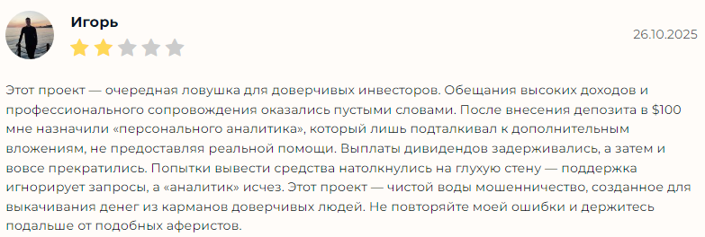 Компания заявляет, что обладает миллионной аудиторией клиентов, а среди ее партнеров числятся десятки тысяч фирм. Но все рассказы о большом успехе кажутся нелепыми, если принять во внимание что электронное представительство брокера было зарегистрировано только 14 августа 2025 года. Фирма явно врет о своем опыте работы и достижениях, чтобы казаться лучше.