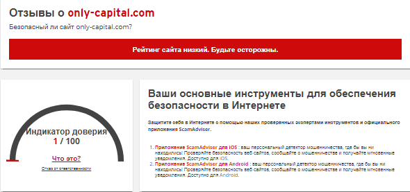 Синтетический анализатор мошенничества выставляет площадке One And Only Capital лишь 1 балл из 100. Это говорит о наличии очень серьезных нарушений в обеспечении безопасности бизнеса.