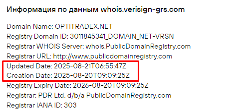 Компания ничего не сообщает о стаже собственной работы. Но учитывая заявления о наличии большой сети представительств, опыт у данного брокера должен быть солидным. Вот только по данным интернет-реестра сайт Opti TradeX вышел в релиз лишь 20 августа 2025 года. Это говорит о том, что фирма очень молодая и стабильной ее функционирования еще не подтверждена.