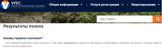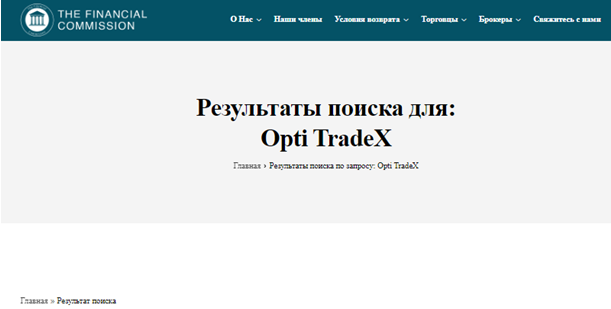 Для создания иллюзии законности своей деятельности администрация выложила на сайте некий разрешающий сертификат. Он выдан организацией Financial Commission. Этот регулятор не имеет серьезного статуса и размещенные в нем данные лишены авторитета. Вместе с тем проведенный на указанном сайте поиск не выявляет здесь учетной записи брокера Opti TradeX.