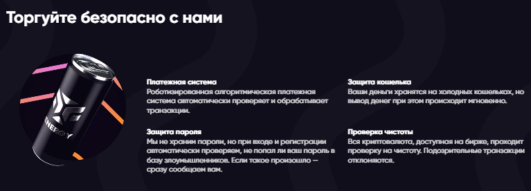 Финансовые транзакции выполняются посредством использования монеты USDT. При этом применяются сети Ethereum и Tron. Брокер обещает быстрый вывод средств с площадки и моментальную обработку трейдерских команд.