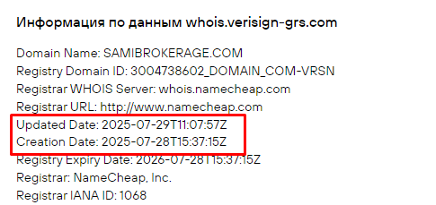 Согласно изложенной в техническом разделе информации, сам сайт Sami Brokerage был запущен в работу еще в 2011 году. Вот только согласно данных интернет реестра эта площадка реально вышла в релиз лишь 28 июля 2025. Исходя из этого, все выложенные на страничке данные об успешном коммерческом функционировании компании являются выдумкой. При таком мизерном стаже работы говорить о каких-то достижениях в бизнесе нельзя. Аферисты выдумали себе историю про успешную карьеру, чтобы активнее заманивать подписчиков в скам.