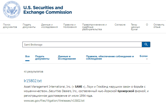 На сайте вообще ничего не говорится о наличии у фирмы официального разрешения на ведение коммерческой деятельности. Учитывая. Что брокер зарегистрирован в США он бы просто не мог работать, если бы у него не было лицензии. Все юридические лица должны здесь иметь учетную запись в United States Securities and Exchange Commission, SEC. Вот только запрос по поводу фирмы Sami Brokerage не дает разоблачающий результат. Зарегистрированное здесь юридическое лицо с именем Sami Brokerage LLC имеет совершенно другие установочные данные. Мошенники присвоили имя честной компании для усиления эффекта скама.