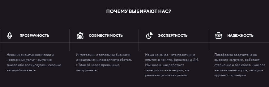Как заявляют создатели брокерской компании Titan AI — они являются симбиозом передовых технологий и финансовых стратегий. Благодаря этому их клиенты могут от обычного майнинга дорасти до стратегий индивидуального инвестирования. Сайт разработан идеально, и соискатель заработка может ознакомиться со всеми нюансами трейдинта, сотрудничая с данным брокером.