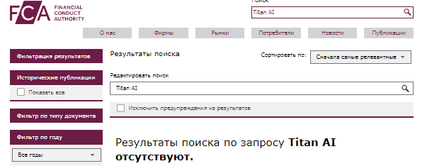 Несмотря на профессионально разработанный сайт, интересную убедительную информацию о финансовом росте и перспективах — здесь все оказалось обычным фейком. Первое, что бросается в глаза опытному аналитику — это отсутствие лицензий и регуляторов. Без них, как все знают, такая деятельность является просто незаконной. На сайте вообще отсутствуют юридические документы. Но, брокер указывает адрес регистрации в Лондоне. Это значит, что у него должны быть разрешительные документы от Управления по финансовому регулированию и контролю Великобритания. В его реестрах отсутствуют данные о компании Titan AI.
