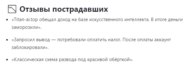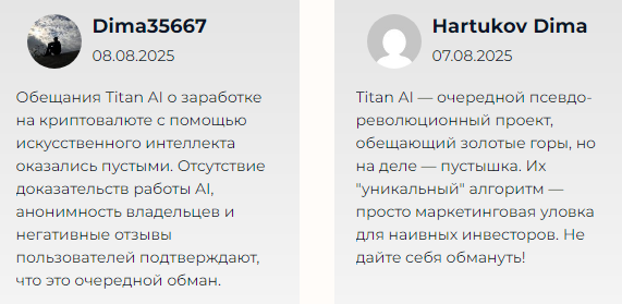 Компания говорит, что начала свою деятельность с 2021 гола, но домен Titan AI был создан лишь в августе 2025 года. Поэтому фактически брокер работает всего несколько месяцев. Тогда откуда взялись стратегии, и системы, разработанные специалистами компании. И даже если это помощь штучного интеллекта, то заработок клиентов все равно должен быть реальным. А такого, по отзывам вкладчиков, попросту нет.