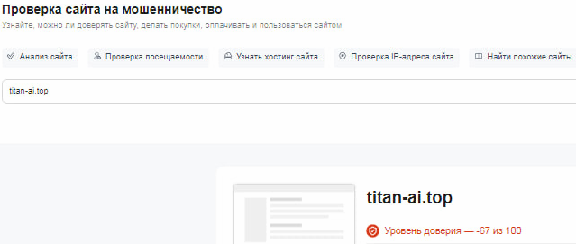 Поэтому совсем неудивительно, что уровень доверия к сайту titan-ai.top критически низкий, а вернее сказать минусовый.