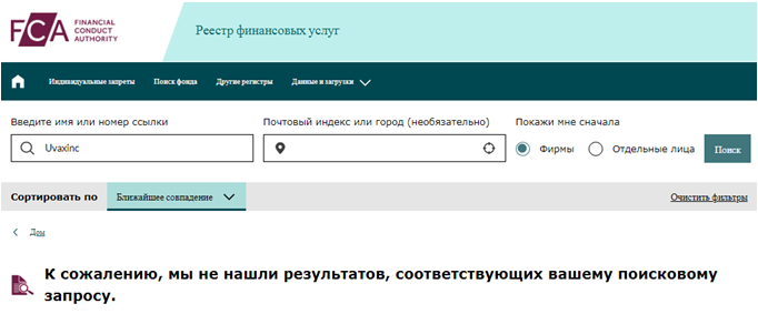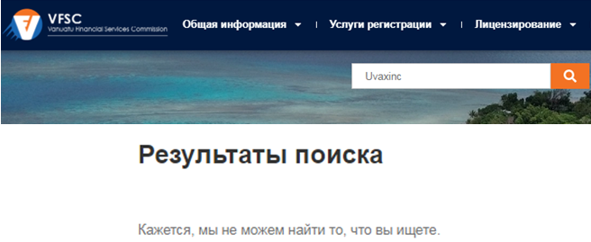 Мошенники прекрасно понимают, что даже начинающие трейдеры обратят внимание на наличие у компании официальных разрешений на работу, поэтому обман в вопросе сертификации деятельности организован особенно продуманно. Uvaxinc указывает на своем сайте, что компания получила одобрение таких известных регуляторов как FCA, DFSA, VFSC, SCCF. Конечно же одними словами доказать статус честной компании нельзя, поэтому мошенники разместили ссылки для перехода на странички аудиторов, где можно самостоятельно убедиться в наличии учетной записи брокера. Вот только предложенные линки являются поддельными, они заведут пользователей на тщательно подготовленные копии представительств контролирующих органов. Подлог можно выявить, если проверить электронные адреса.