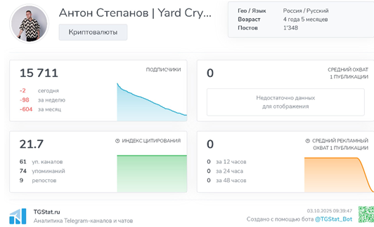 Отзывов о Телеграмм-канале Антон Степанов | Yard Crypto вполне достаточно, чтобы иметь преставление о нем. Популярность этой площадки реальная низкая. Пользователи не считают администратора экспертом, его посты ни у кого доверия или уважения не вызывают.