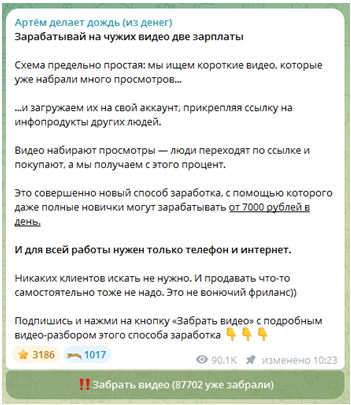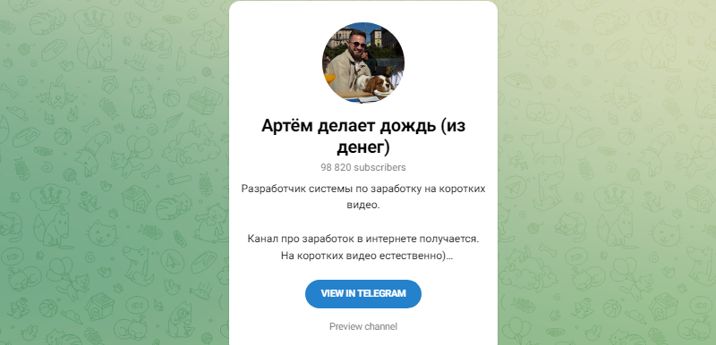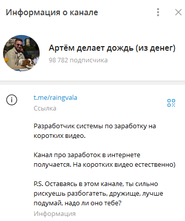 Телеграмм-канал Артём делает дождь (из денег) создан только для выманивая средств подписчиков. Администратор активно предлагает бесполезный информационный продукт, который якобы может помочь разбогатеть кому угодно. Но в реальности тут зарабатывает только ведущий, а подписчики будут бесконечно долго ждать выплат.