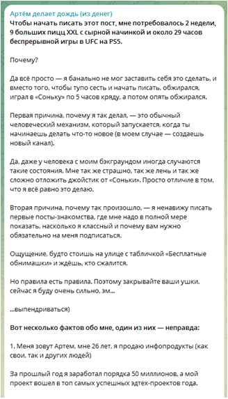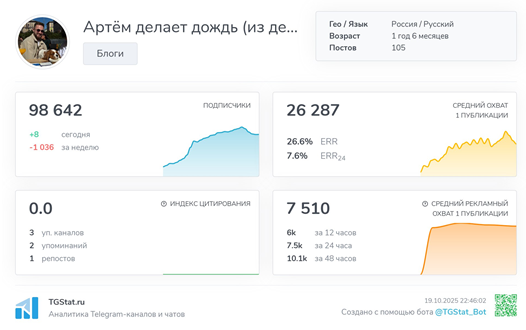 На день проведения обзора Телеграмм-канал Артём делает дождь (из денег) обладал клиентской базой в 98 782 участника. Учитывая, что ресурс действует всего лишь полтора года такой показатель выглядит просто превосходным. Только вот на самом деле ситуация не внушает оптимизма.