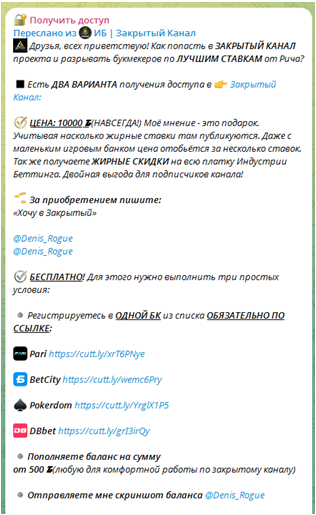 Доступ в ВИП-клуб администратора осуществляется на платной основе. Для того чтобы получить абонемент в закрытый канал необходимо написать ведущему личное сообщение. Обычно он отвечает быстро, а значит начать делать продуктивные ставки можно уже в день, когда принято решение о выборе пути коммерческого беттинга. Цену на услуги сложно назвать скромной — она составляет 10 тысяч рублей. Рич утверждает, что благодаря высокой проходимости сигналов эта сумма быстра окупится.