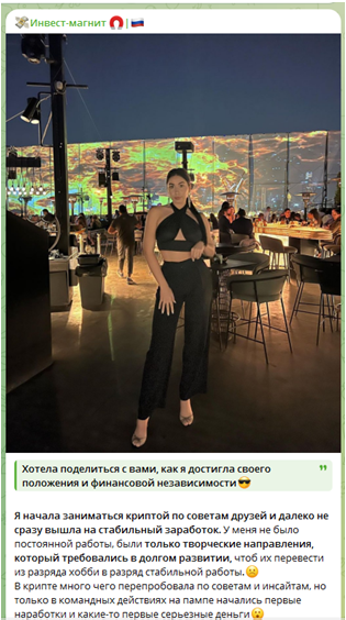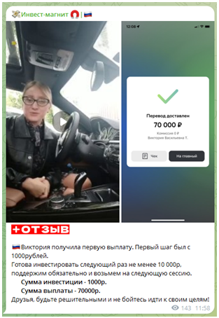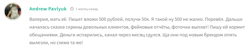Администратор выманивает у подписчиков депозиты под предлогом получения прибыли, но на самом деле никаких выплат не производит. Более того, после основной инвестиции Валерия убеждает пользователей оплатить страховку, налоги и антифрод. Якобы все эти расходы будут компенсированы в результате успешной сделки.