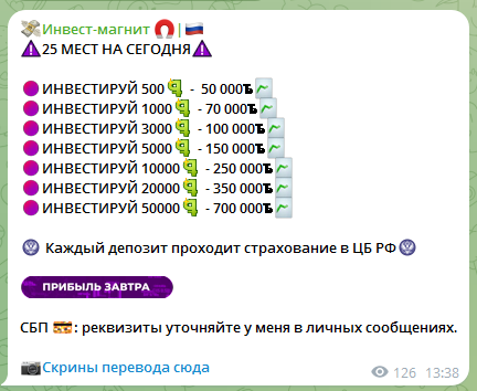 Ведущая Валерия скорее всего лишь нанятая актриса, а реально за работой Телеграмм-канала 💸Инвест-магнит 🧲|🇷🇺 стоят профессиональные скамеры. Любые вложенные сюда средства можно считать потерянными. Администрация не собирается пускать деньги в оборот и выплачивать дивиденды.