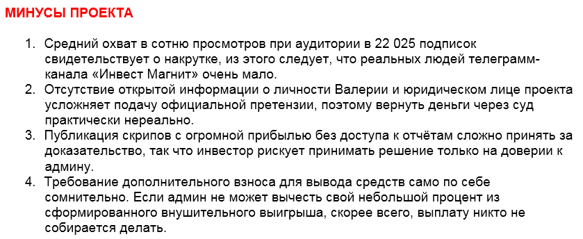 Честную обратную связь про канал 💸Инвест-магнит 🧲|🇷🇺 можно найти на независимых форумах. Обычные пользователи и эксперты единогласно называют этот ресурс скамерской площадкой.